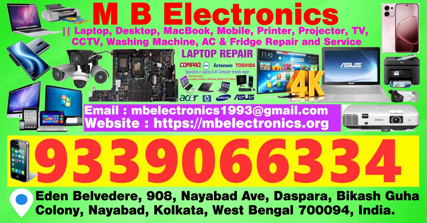 "M B Electronics" is a trusted name when it comes to Laptop & Desktop Repair and Service in Kolkata and nearby areas. Our services are available all over Kolkata. We help people across the Kolkata and nearby areas offering laptop repair & services in Kalikapur কালিকাপুর, Haltu Kolkata, West Bengal, Mukundapur মুকুন্দপুর, Kolkata, West Bengal, Purbalok পূর্বালোক, Mukundapur Kolkata, West Bengal, Ganga Nagar গঙ্গা নগর, Mukundapur, Kolkata, West Bengal, Santoshpur সন্তোষপুর, Kolkata, West Bengal, Khudirabad খুদিরাবাদ, Daspara, Bipadbhanjan Colony, Bhagabanpur, West Bengal, Bhagabanpur ভগবানপুর, West Bengal, Daspara দাসপাড়া, Mukundapur, Kolkata, West Bengal 700152, Ajoy Nagar অজয় নগর, Santoshpur, Kolkata, West Bengal 700099, Budherhat বুদ্ধেরহাট, Pancha Sayar, Kolkata, West Bengal, Nayabad নায়াাবাদ, Kolkata, West Bengal, Atghara আটঘড়া, Nayabad, Kolkata, West Bengal, Kantipota কাঁটিপোতা, West Bengal 700150, Panchpota পঞ্চপোতা, Kolkata, West Bengal, Malikpara মালিপাড়া, Mauza Panchpota, Kolkata, West Bengal, Mirzapur, মিরজাপুর, Techno City, Kolkata, West Bengal 700152, Gangajoara, গান্গাজারা, Panchpotam, Kolkata, West Bengal 700150, Khurigachi খুড়িগাছি, Kolkata, West Bengal 700150, Tihuria তিহুরিয়া, West Bengal 700150, Srinagar, শ্রীনগর, Panchpota, Kolkata, West Bengal, Dhalua ধালুয়া, Panchpota, Rajpur Sonarpur, West Bengal 700152, Pancha Sayar পাঞ্চয় স্যার, Kolkata, West Bengal, etc.